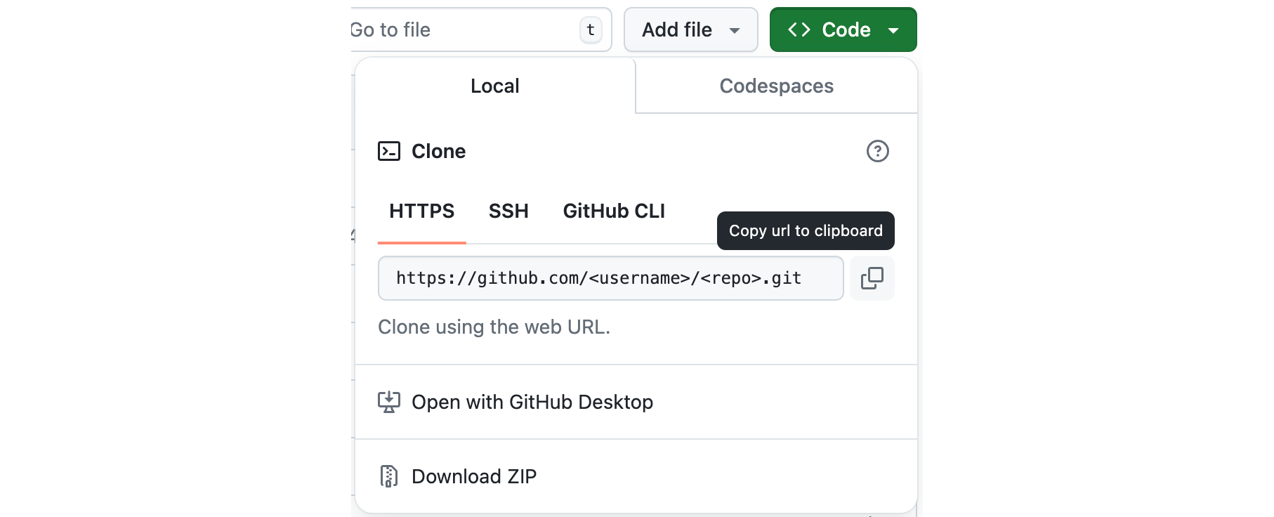 - Go back to your remote repo, click Code and copy the HTTPS URL on the Local tab, e.g.