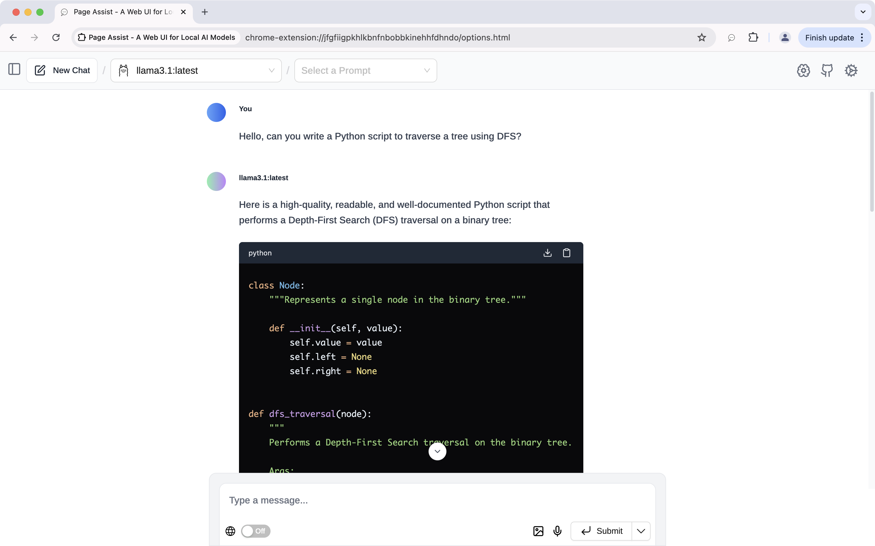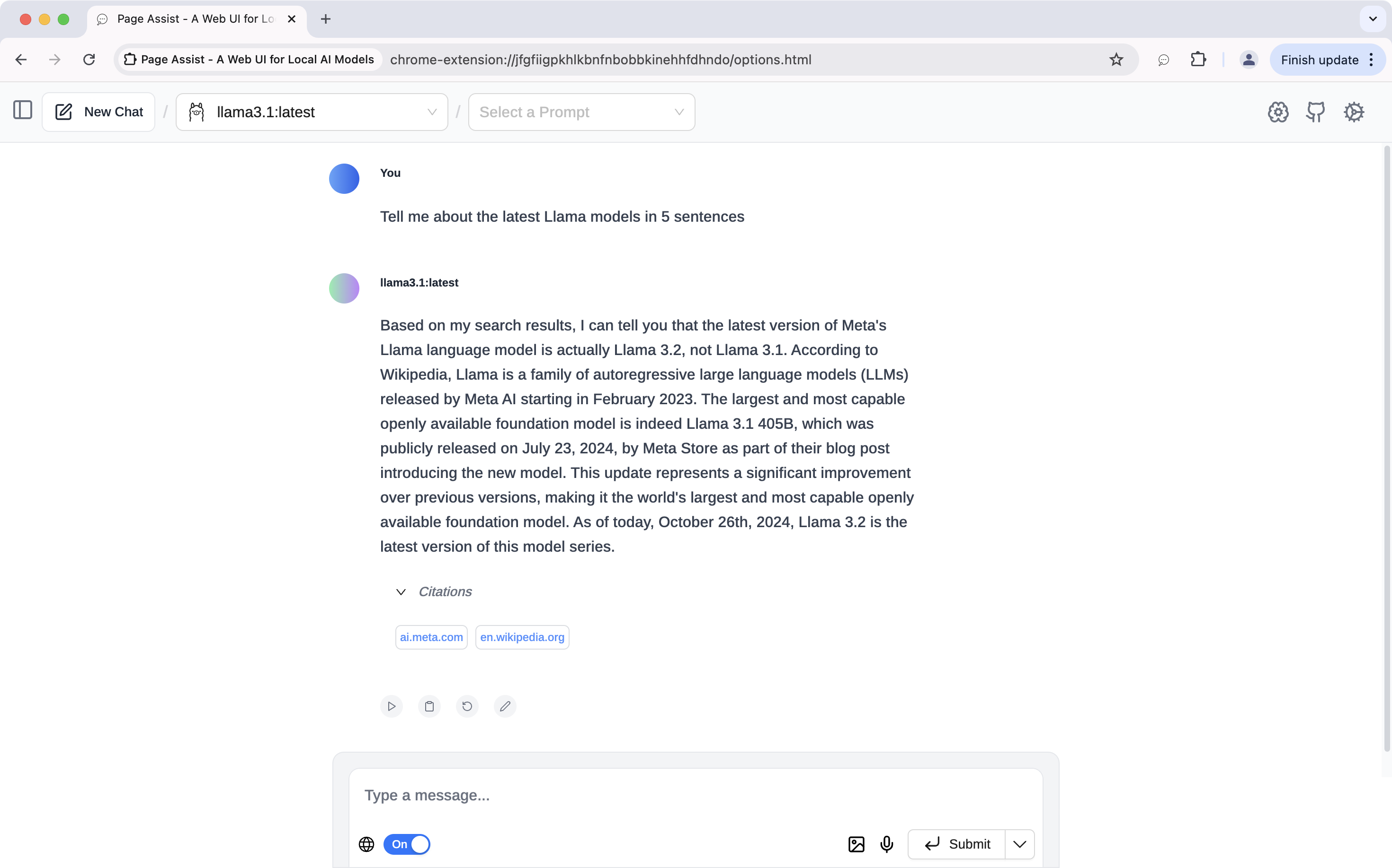 The CLI is fine, but if you prefer a GUI, open your browser and activate the Page Assist extension by clicking its icon or using the shortcut cmd + shift + L.