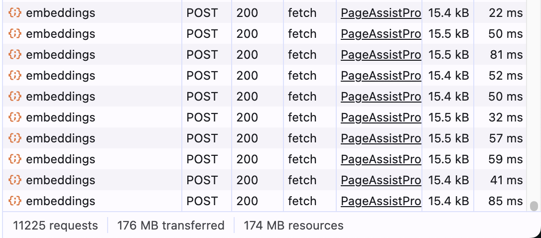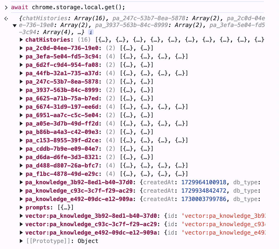 The embeddings and other data are stored in Page Assist’s local storage, which can be inspected by running await chrome.storage.local.get() in Chrome’s Console.