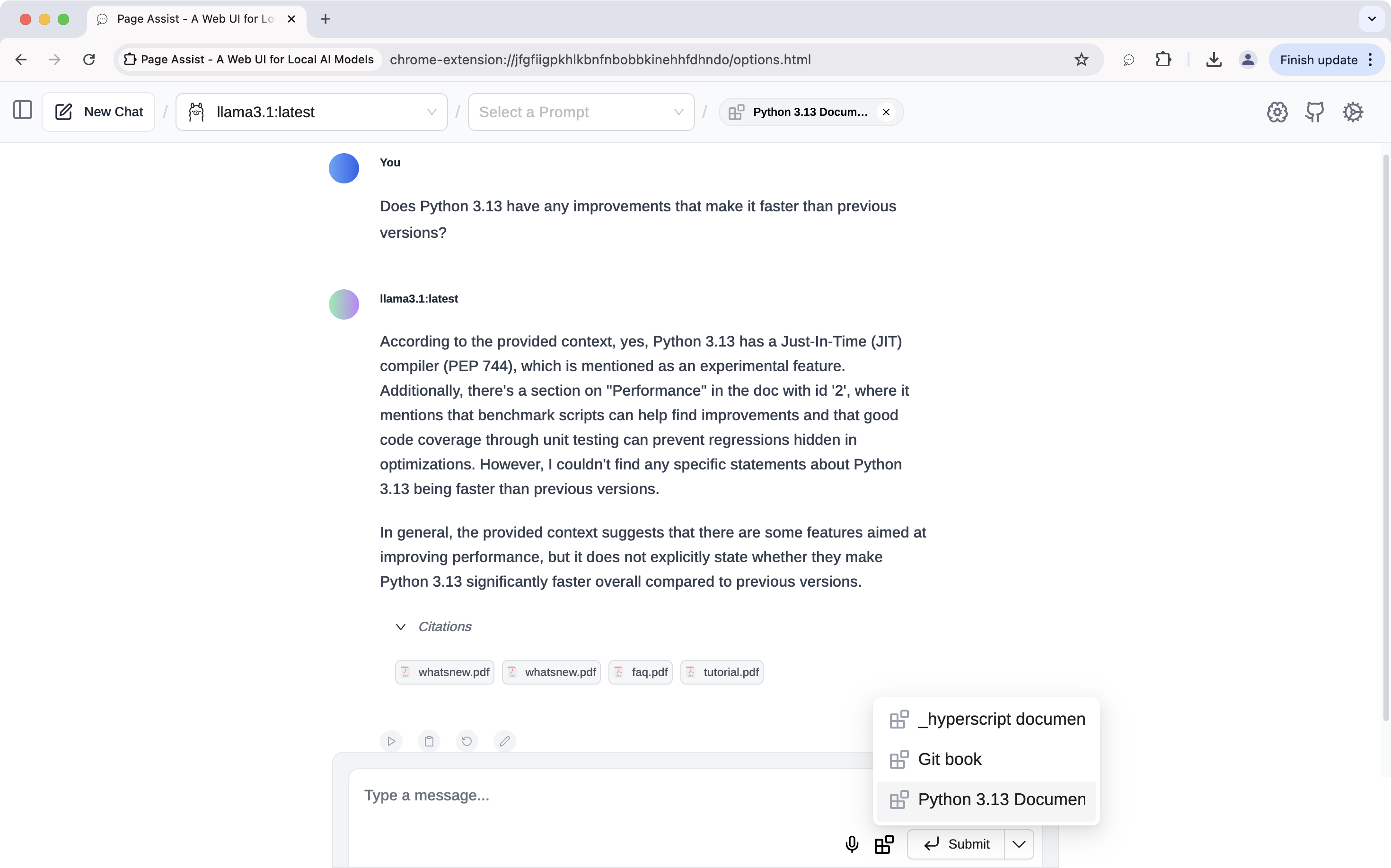 Page Assist can help you find relevant information in documents (including web pages) thanks to a technique called Retrieval-augmented generation (RAG). I will talk about the technical details later, for now let’s learn how to make use of it.