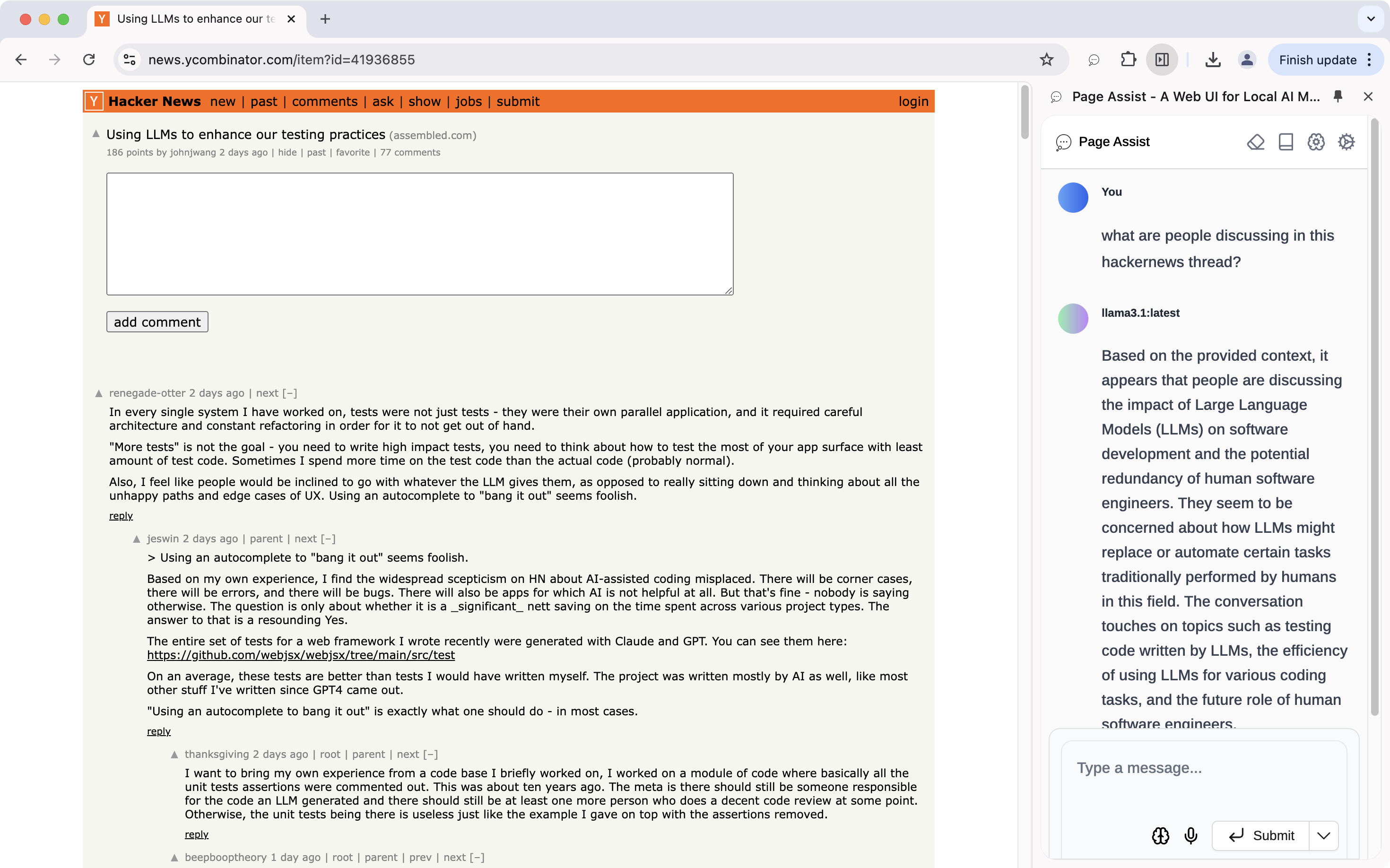 Hit cmd + shift + P to open a side panel that allows you to ask the LLM about the current web page you are on. Remember to check the Chat with current page checkbox first.