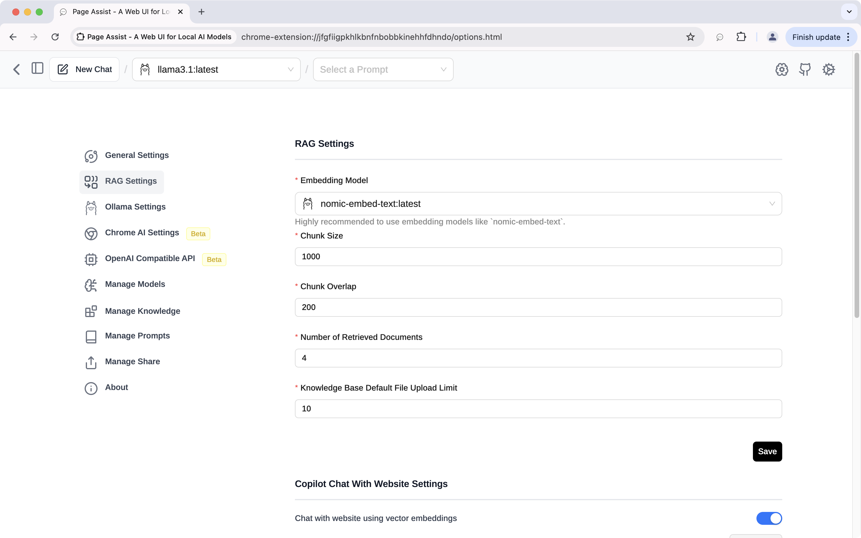 To configure RAG in Page Assist, go to Settings > RAG Settings. We already chose nomic-embed-text:latest as the embedding model. You can leave other settings as is or update them to be the same as mine.